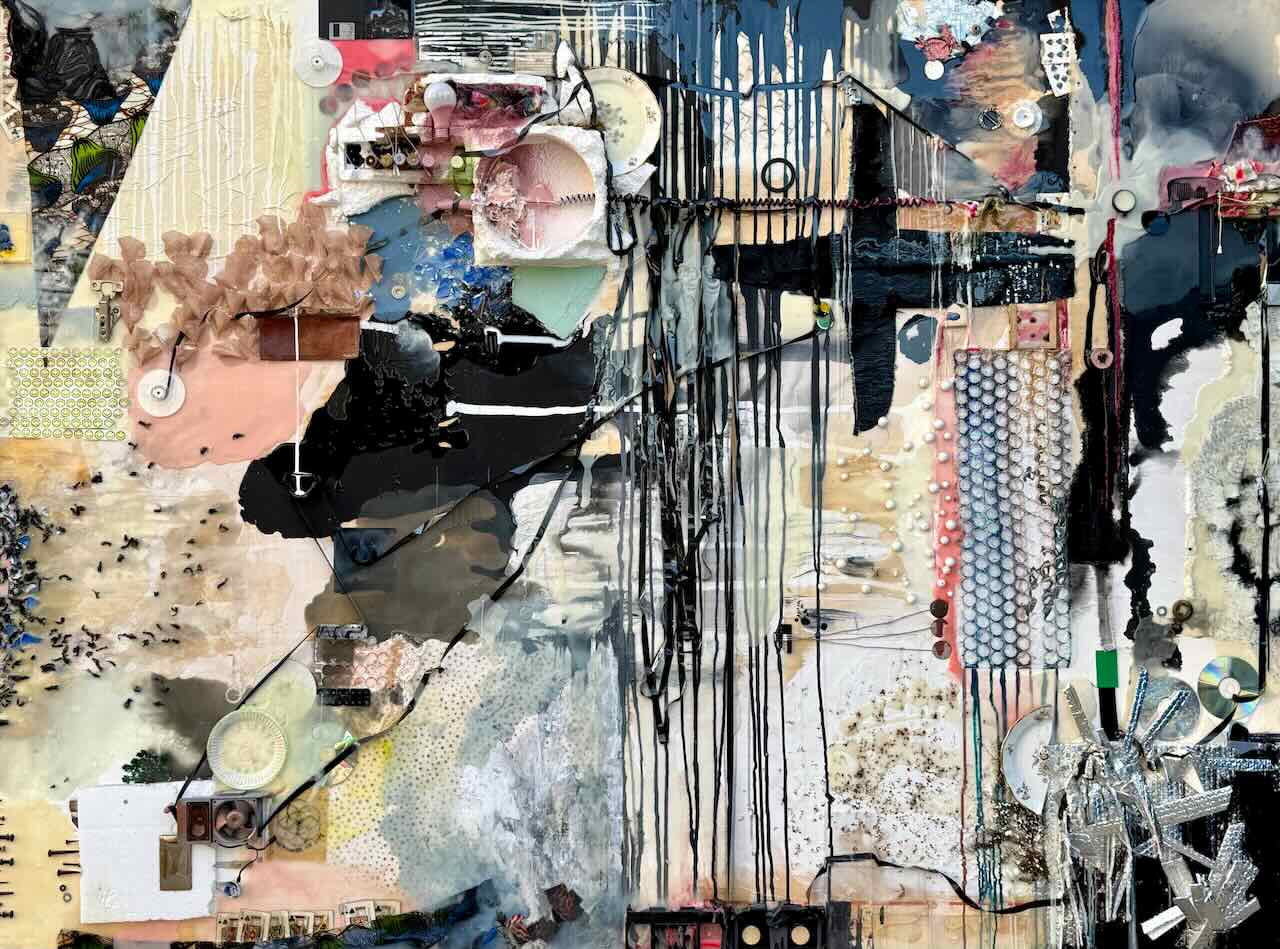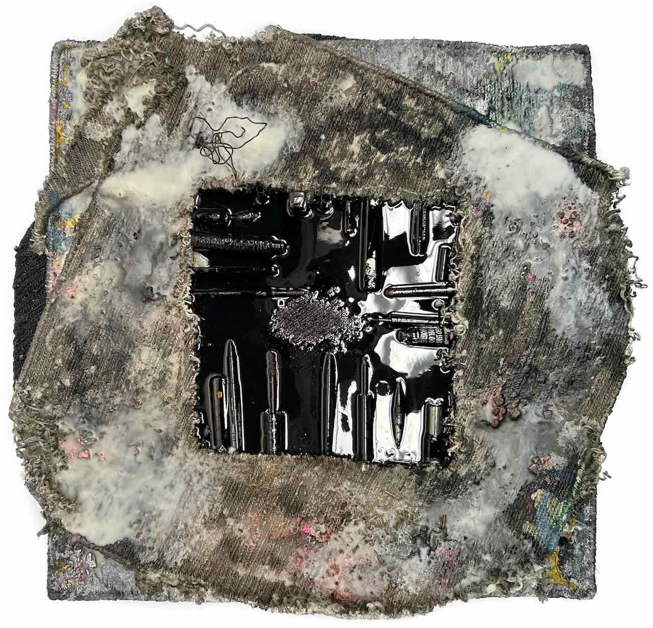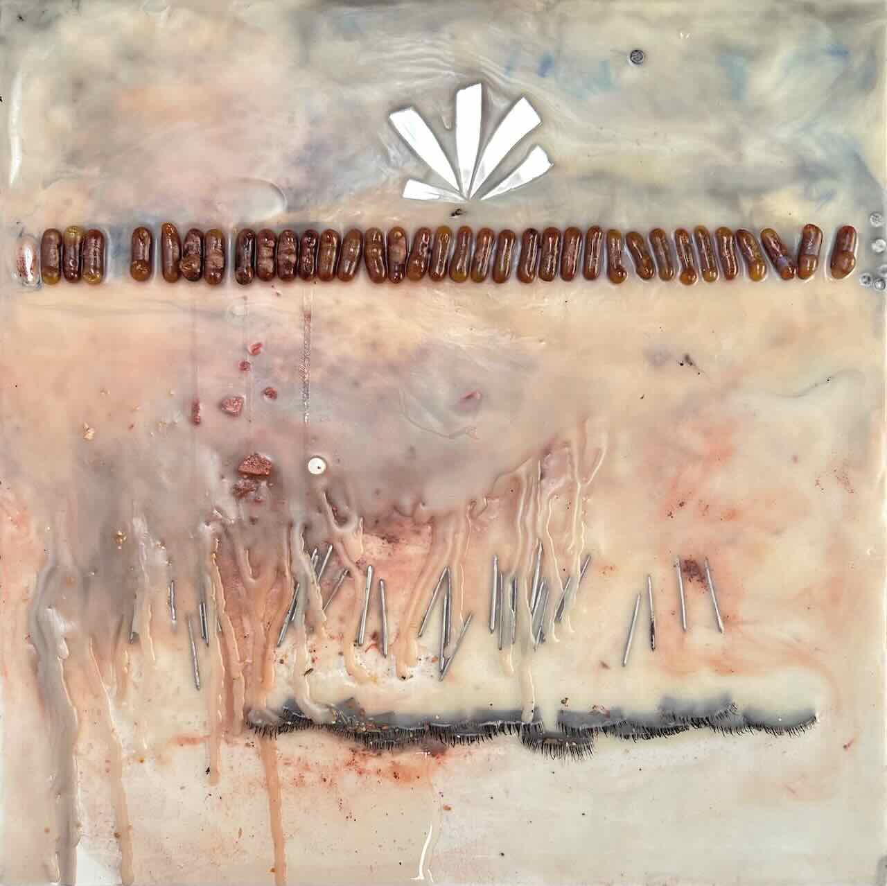 Flor Quinto describes her process as a conversation with mystery. Her sculptural paintings include used objects, discarded from her own life or that of a loved one. Her compositions come together in the moment, guided by the play between materials. Wax and resin flow between shattered glass. Warped cassette tape becomes drawing. Capsules explode under the heat gun. Eye shadow crumbles, a new texture is born.Through this practice of salvage and transformation, Flor is exploring her complicated relationship with change. Every finished piece is part personal archaeology, part celebration of the profound stories embedded in our most overlooked possessions. Each piece asks: What do we keep? What do we release? And what happens in that space between holding on and letting go?