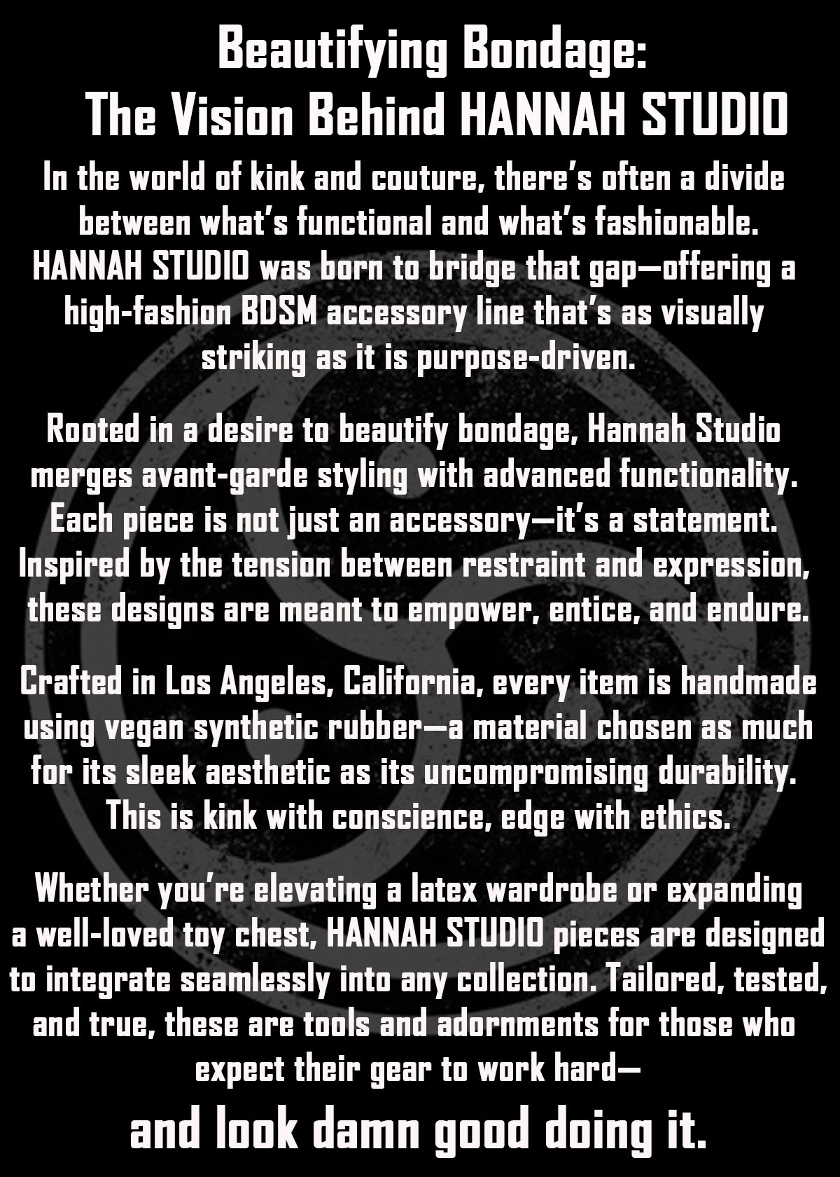 In the world of kink and couture, there’s often a divide between what’s functional and what’s fashionable. HANNAH STUDIO was born to bridge that gap—offering a high-fashion BDSM accessory line that’s as visually striking as it is purpose-driven. Rooted in a desire to beautify bondage, HANNAH STUDIO merges avant-garde styling with advanced functionality. Each piece is not just an accessory—it’s a statement. Inspired by the tension between restraint and expression, these designs are meant to empower, entice, and endure. Crafted in Los Angeles, California, every item is handmade using vegan synthetic rubber—a material chosen as much for its sleek aesthetic as its uncompromising durability. This is kink with conscience, edge with ethics. Whether you’re elevating a latex wardrobe or expanding a well-loved toy chest, HANNAH STUDIO pieces are designed to integrate seamlessly into any collection. Tailored, tested, and true, these are tools and adornments for those who expect their gear to work hard—and look damn good doing it.